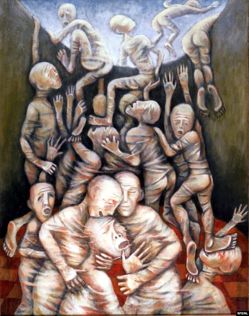 А. Тешебаев: -Австрияны алсак, буларда негизинен абстракция үстөмдүк кылат. Көбүн эсе сүрөттүн эч мааниси жок, тек боектордун кыймылдарын көрөсүң. Буларда ой берүү деген, теманы коргоо деген жок. Тек гана боектордун оюнун көрөсүң. Жалпы агым ушундай.