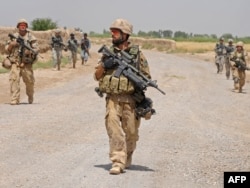 НАТО жетектеген эларалык күчтөрдүн курамындагы канадалык(ортодо) жана америкалык жоокерлер черүүдө. Ооганстан. Кандагар провинциясы, Данд вилаети, Буланди кыштагы. 17-май 2010