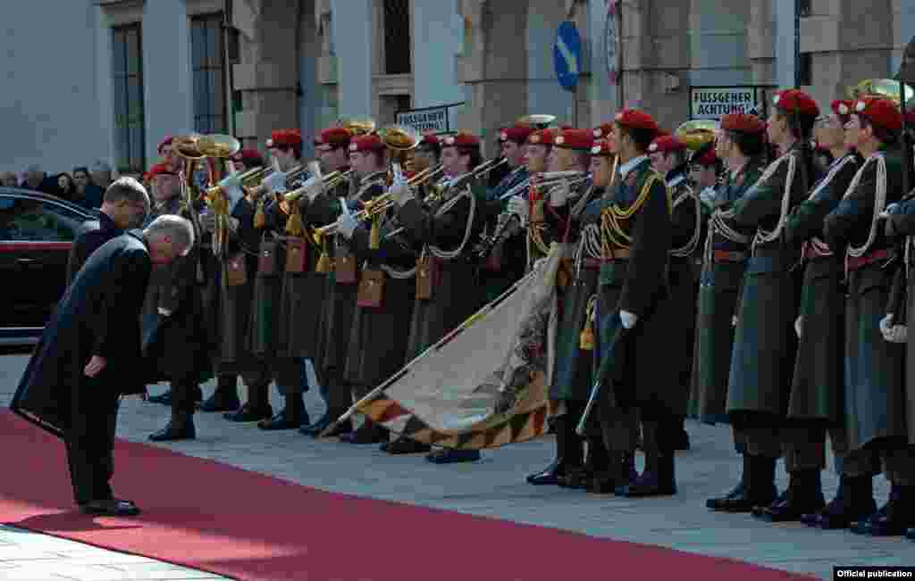 Бүгүн Венада Кыргызстандын президенти Алмазбек Атамбаев Австриянын федералдык президенти Хайнц Фишер менен жолугушту. Фишер Атамбаев баштаган кыргыз делегациясын Хофбург Ак сарайынын алдындагы парад аянтында жубайы жана расмий бийлик өкүлдөрү менен бирге тосуп алды.