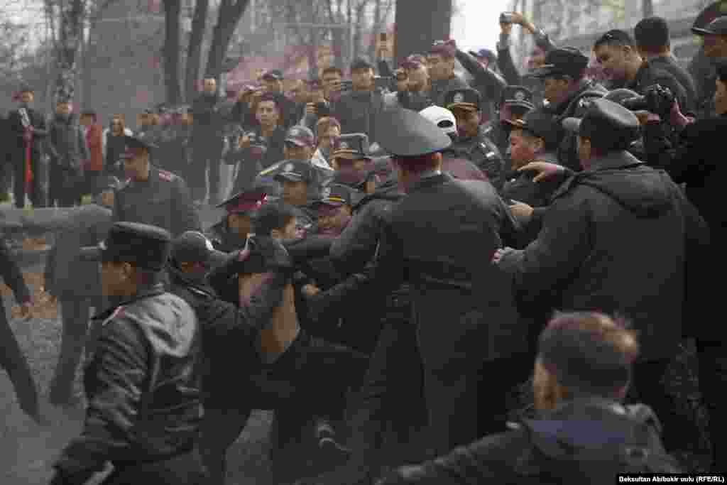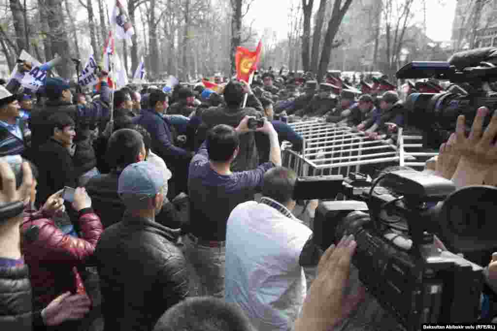 УКМК алдындагы Садыр Жапаровду коргоо митингинде милиция менен эл тирешти. Митингчилер милициянын курчоосун жарып өтүп имаратка кирүүгө аракеттенди. Мунун негизинде бир нече адам камалды.