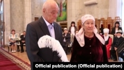 “Жакут той”- үйлөнгөнүнө 60 жыл болгон эки жуп, “алтын той” - баш кошконуна 50 жыл болгон 14 жуп салтанаттуу түрдө нике каттоочу китептерге кол коюп, Бакыт өргөөсүндө жакындары менен сүрөткө түштү.