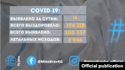 Жалпысынан өлкөдө коронавирустан көз жумгандардын расмий саны 2946 адамга жетти. Соңку бир күн ичинде вирус менен дагы 15 адам катталды. Алардын эң көбү Бишкек шаарында (10 адам).