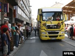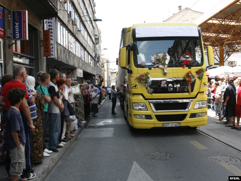 Сребреницадагы кыргында өлтүрүлгөн адамдардын сөөктөрү салынган машинелер Поточаридеги мемориалдык борборго сөөктөрдү жайга берүү үчүн баратат. 11-июль 2009-жыл.