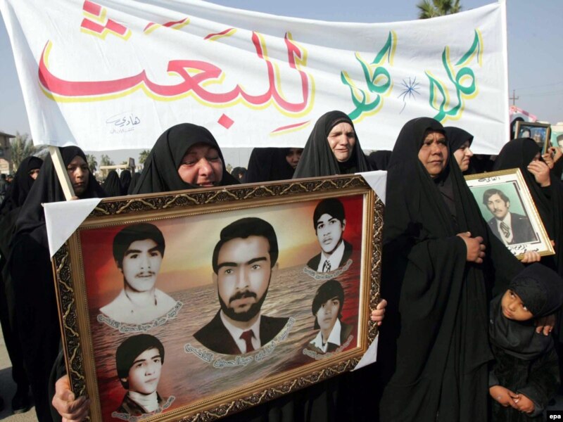 Ирактык аялдар Саддам Хусейн заманында өлтүрүлгөн жакын туугандарынын сүрөттөрүн көтөрүп баратышат. Багдад. 21-январь 2010