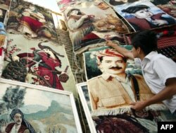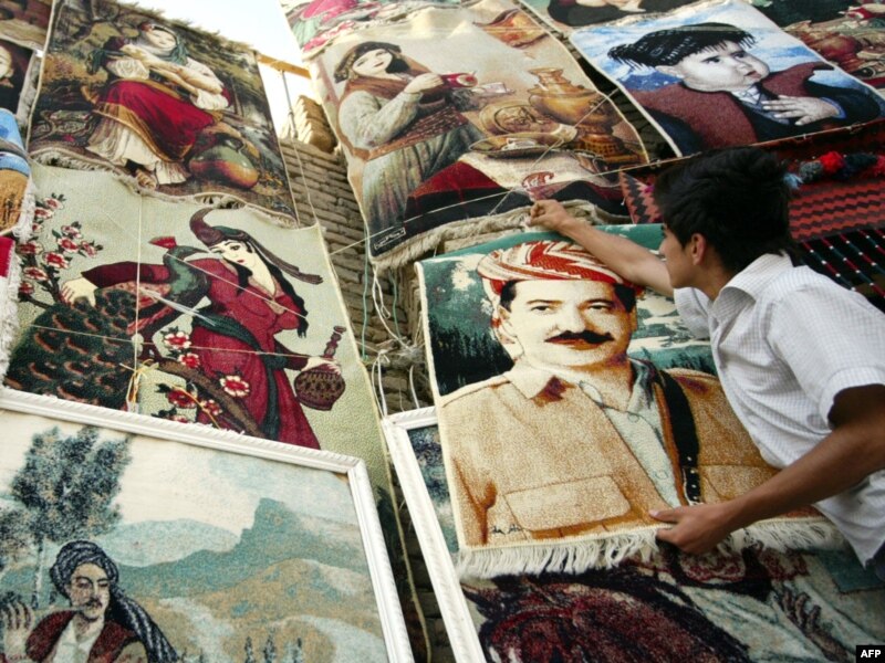 Ирактык күрт күрт регионунун президенти, Күртистан демократтык партиясынын төрагасы Масуд Барзанинин сүрөтү түшүрүлгөн килемчени илүүдө. 27-июль. Ирбил.