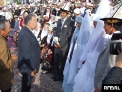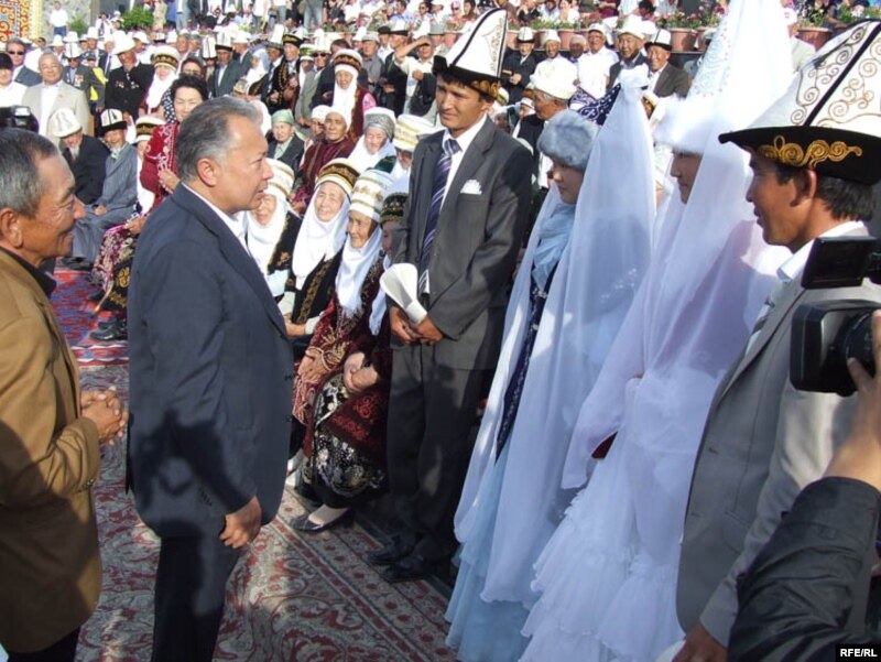 “Аалам Ордо” театрынын ачылышы менен бирге ошол жерде иштеп, жашаган 2 жигиттин үйлөнүү аземи да өтүп, баш кошкон жаштарга Курманбек Бакиев батасын берди.