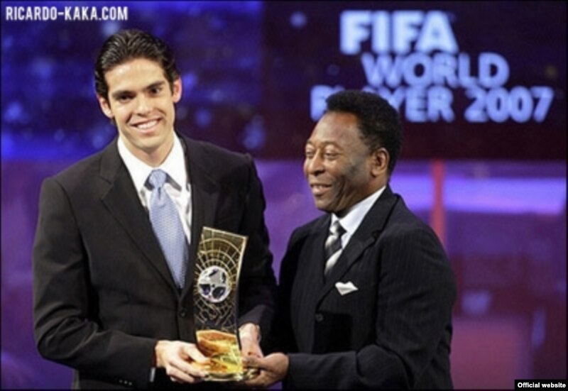 Футболдун падышасы Пеле бразилиялык оюнчу Какага "Бриллиант топту" тапшырууда. Цюрих. 18-декабрь, 2007-ж.