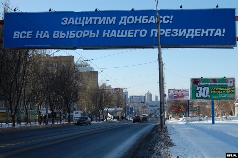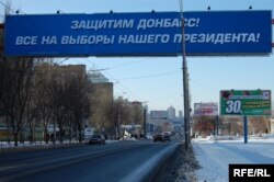 Донецк шаарындагы Янукович үчүн добуш берүүгө чакырган тасма.
