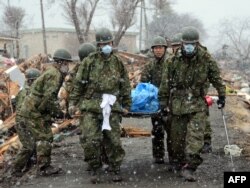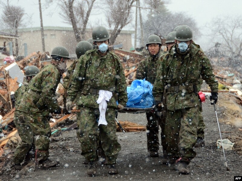 Жапон аскерлери урандылар астынан табылган жасатты көтөрүп баратышат. 17-март 2011