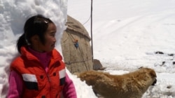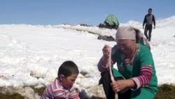 Кар түшкөн жайлоодогу малчы теребелге дүрбү салууда, 19-июнь, 2013.