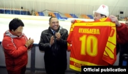 Хоккей федерациясынын президенти Анварбек Оморканов өлкө башчысына 10-номурдагы хоккейчинин футболкасын тапшырууда.