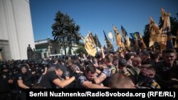 Порошенко сүйлөп жаткан кезде парламент имаратынын алдында полиция менен демонстранттар кагылыша кеткени маалымдалды. Төрт киши жараат алды, кеминде бир полициячы ооруканага жеткирилди.
